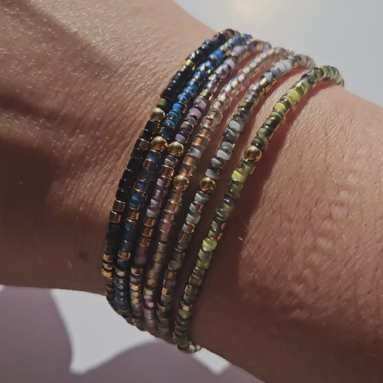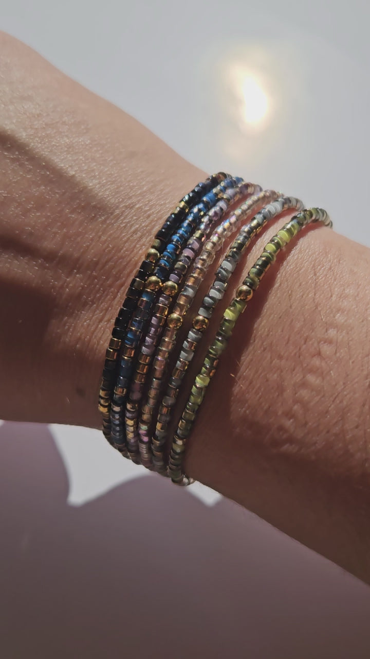 Minimaliste sur fil élastique et perles rocaille 2mm colorées et dorées avec une perle en acier inoxydable.