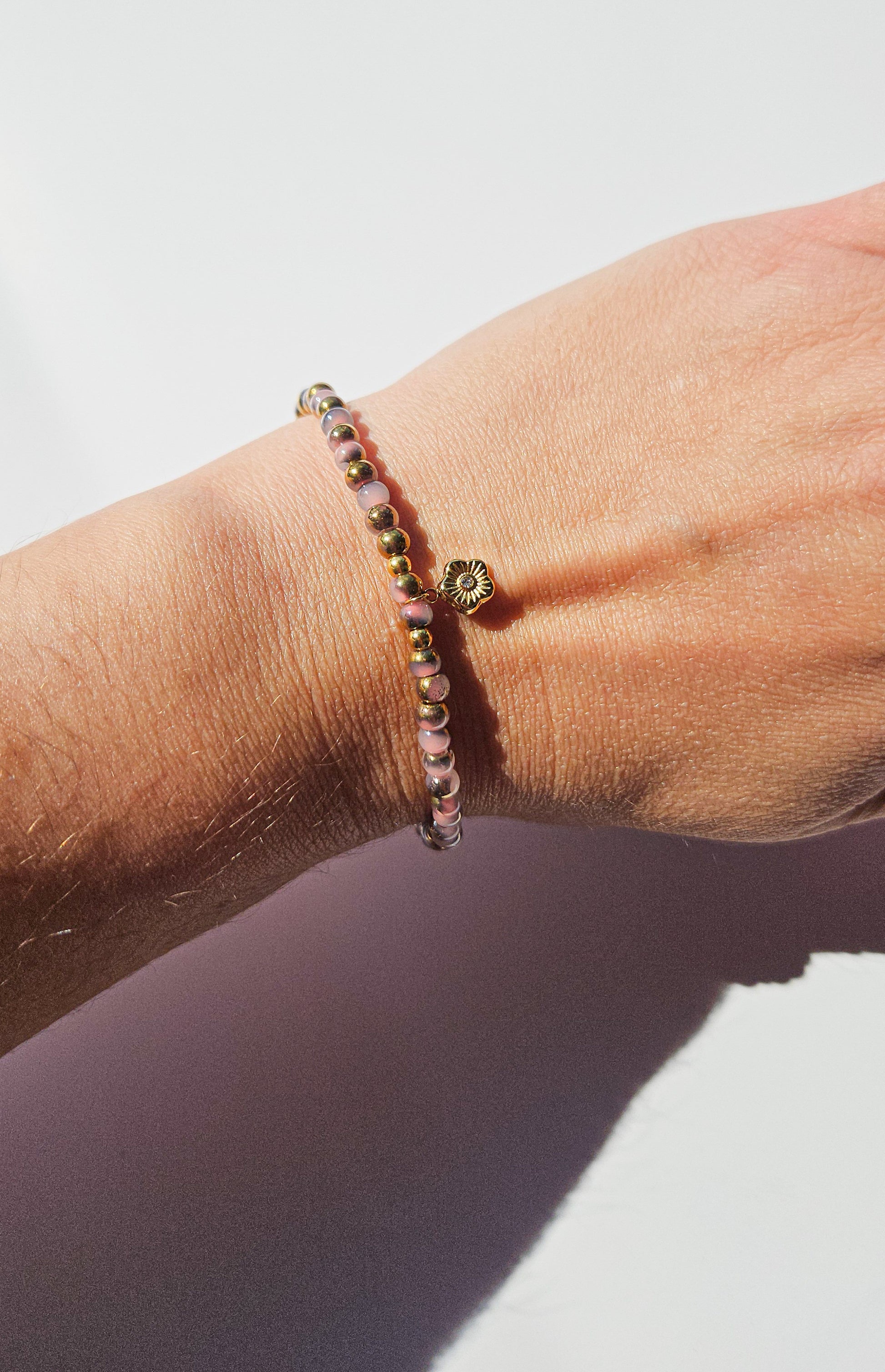 Monté sur fil élastique avec perles de rocailles 3mm, perles dorées en acier inoxydable et breloque acier inoxydable et strass fleur.