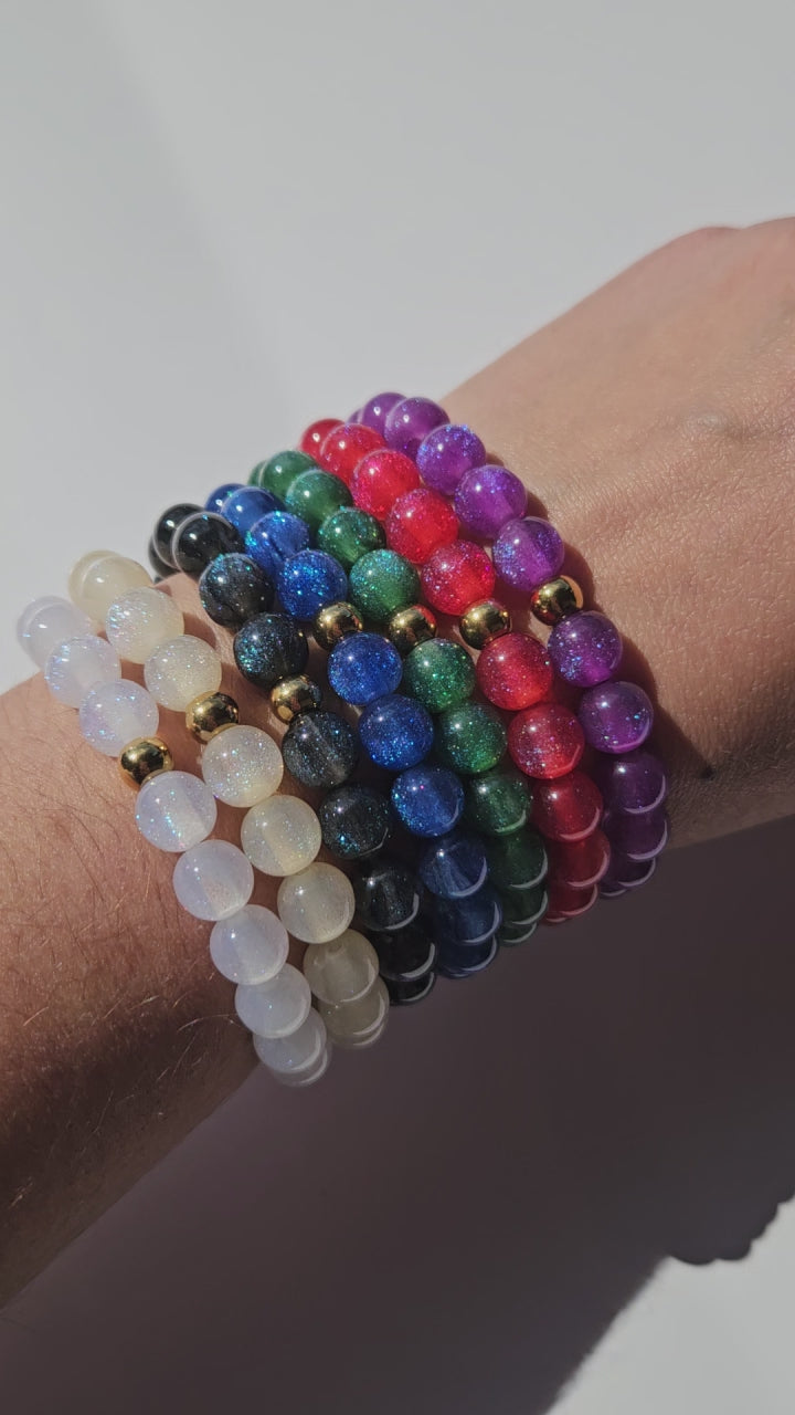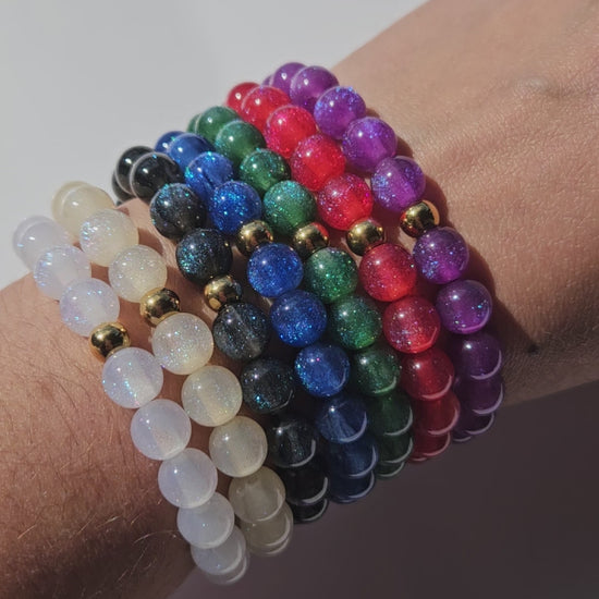 Bracelet à paillette Mila : monté sur fil élastique avec perles de verre et perle dorée en acier inoxydable .