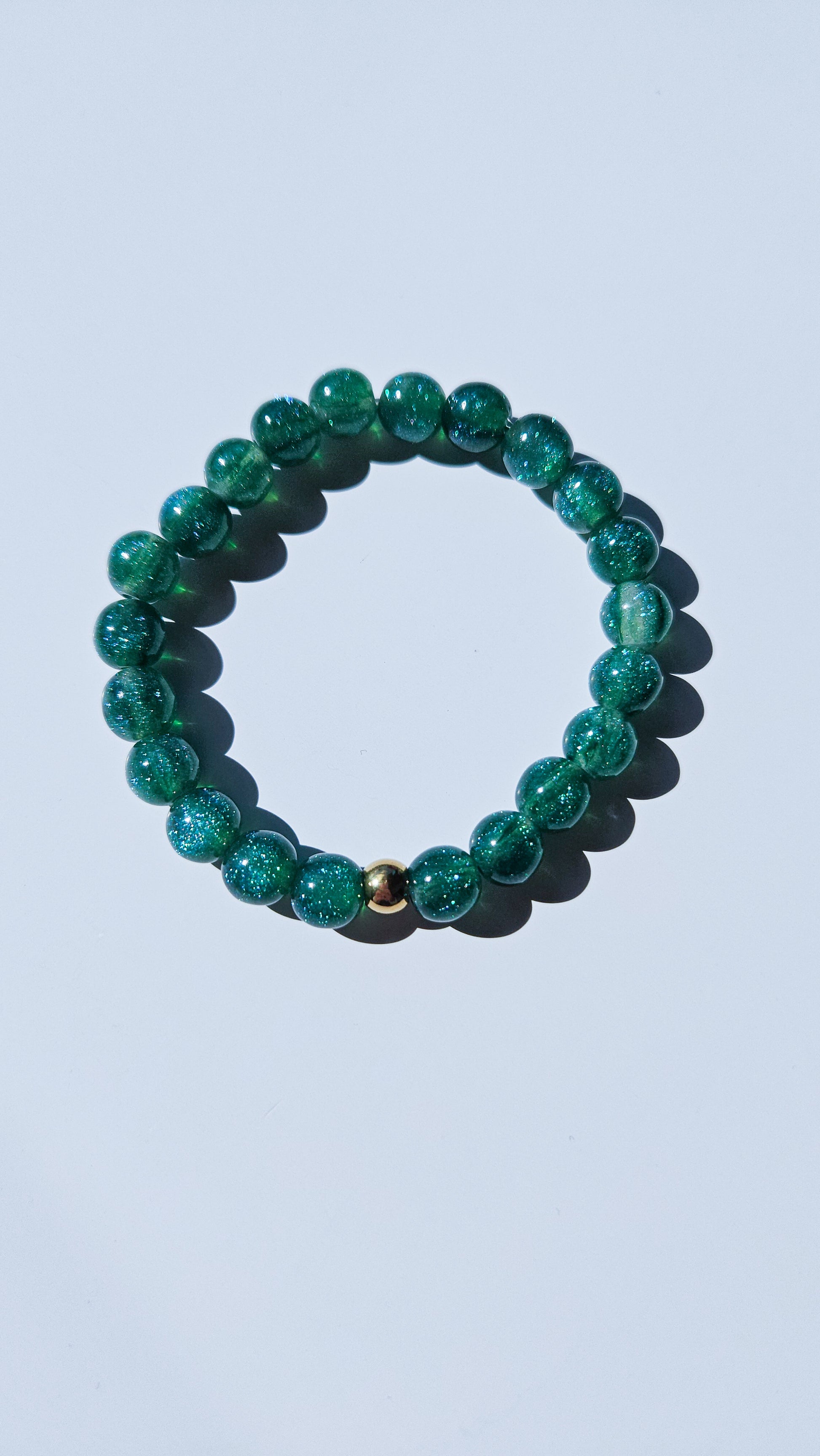 Bracelet à paillette Mila : monté sur fil élastique avec perles de verre et perle dorée en acier inoxydable .