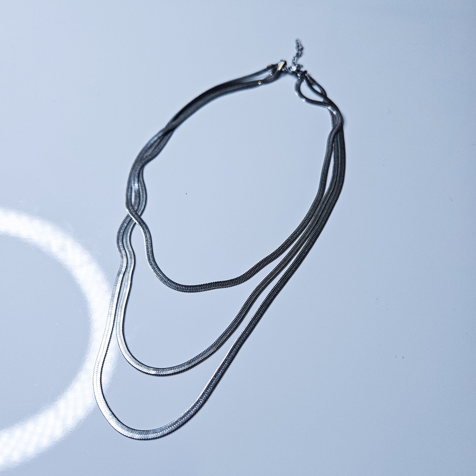 Ce collier avec des chaînes plates à trois couches offre un look chic et contemporain. Fabriqué en acier inoxydable, il résiste à l’eau et au temps, sans nickel, sans cadmium et sans sel de plomb